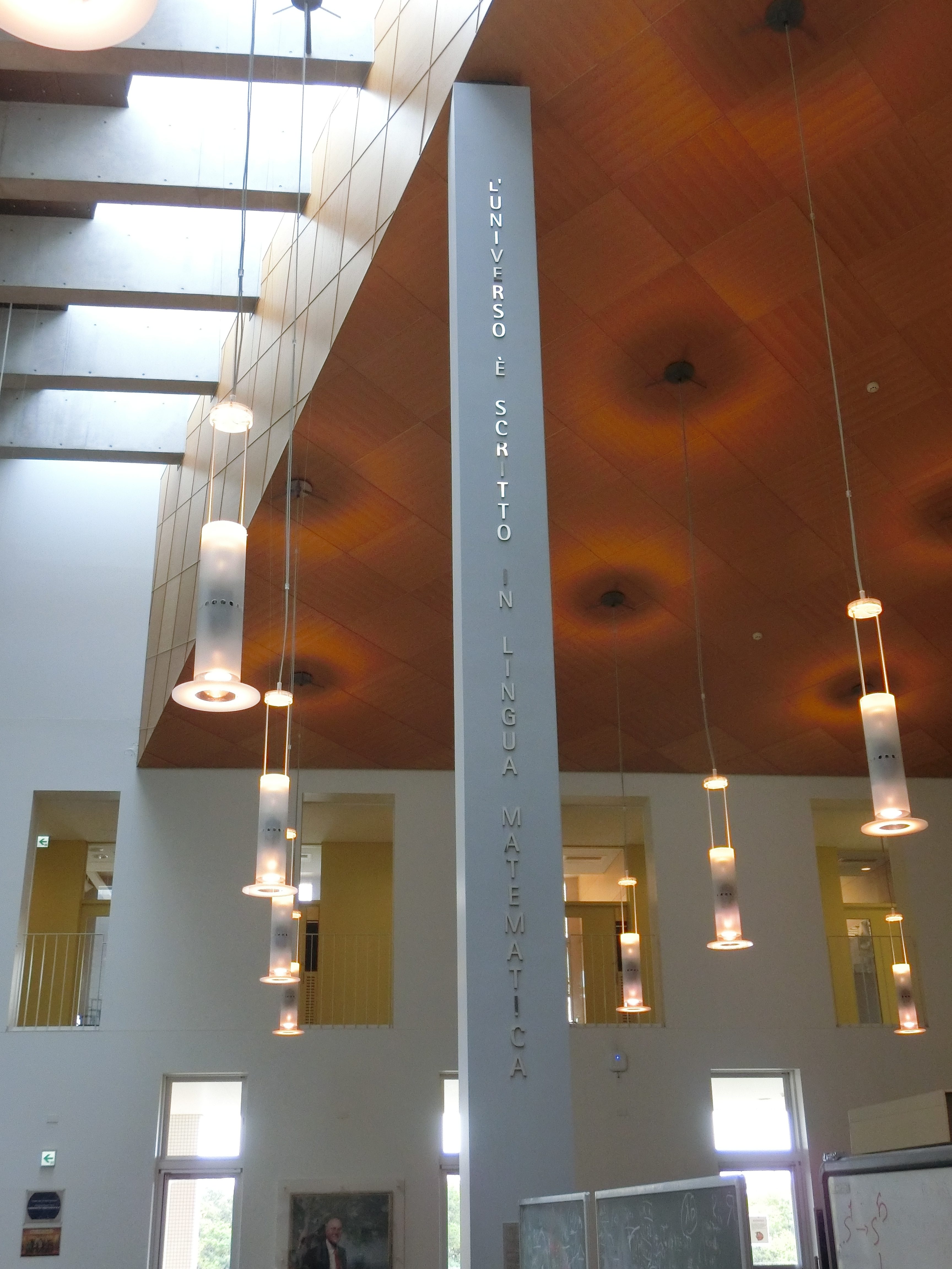 IPMUのロビーの柱にあるガリレオの言葉「宇宙は数学という言葉で書かれている」のラテン語→