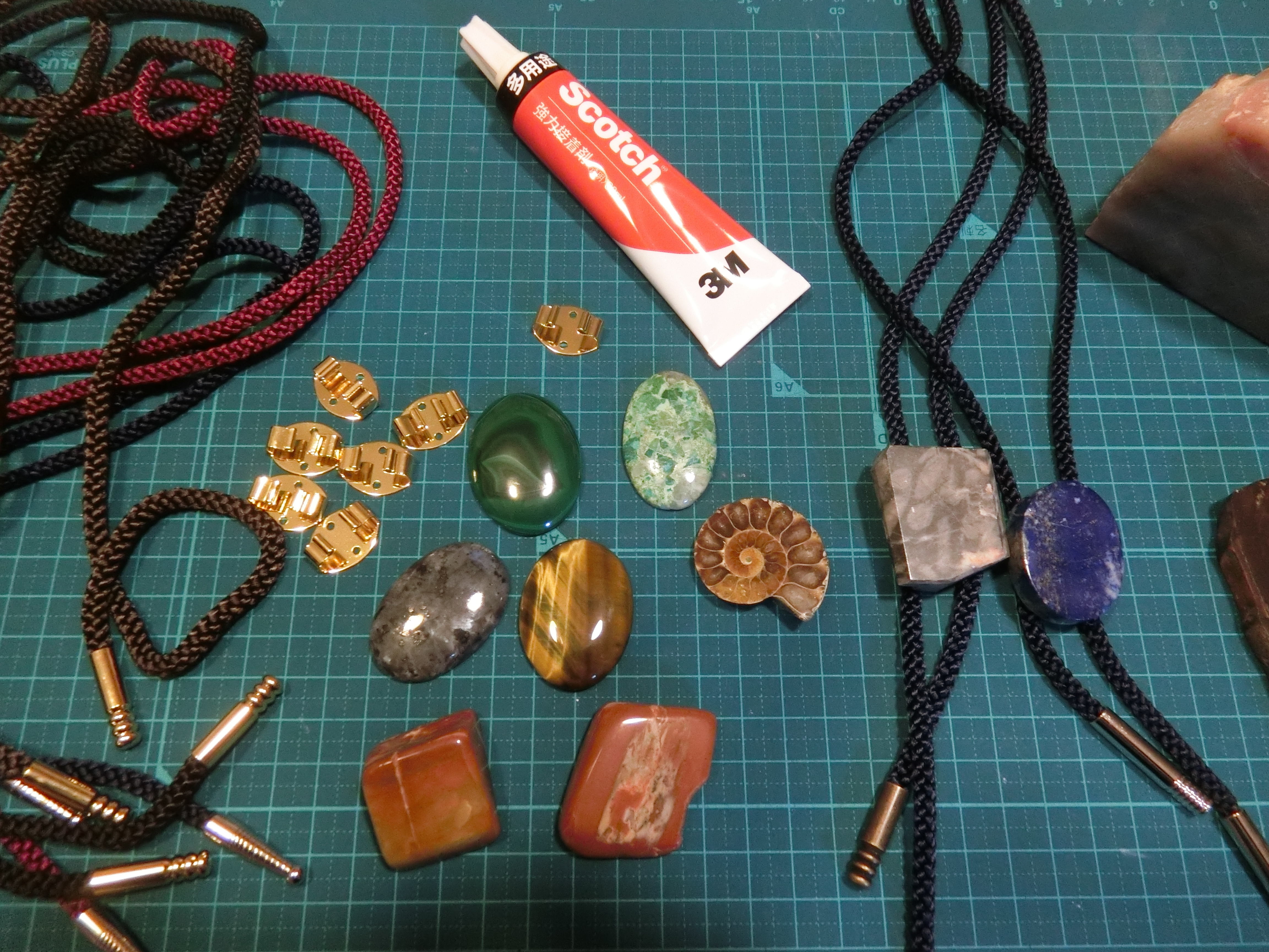 ループタイは、日本では高齢者がしているイメージですが、アメリカ人がよく使っていて、例えば西部劇にでてくる保安官や大学教授なんかがしていると思います。これでも、ネクタイしてるんです、とフォーマルなところでも一応主張できるし、なによりきつく締め付けることがないので、夏のクールビズ感覚でするようになりました。はじめは父親の形見の3本くらいをしはじめたのですが、どこに売っているかというと、洋服の○○などのビジネス紳士服店では売っていないのですね。老舗のデパートで店員に尋ねるとこちらだけの品でございますと、ほんの数本だけおいてあったりでした。なんか、土産物店のような場所に似合うような気がしてきました。そして、ネットで探したら飾り部分が天然石のものが見つかりました。で、2本ほど取り寄せてみると、これは紐と金具が全部共通なので、石に金具をボンドでつければ簡単に自作できることに気が付いたのです(紐と金具はユザワヤに売っています)。というわけで、すでに4本ほど作りましたが、今回ミネラルショーの出店の中にアクセサリーパーツの店を見つけて、金具がおいてあったので、1000円以下の石をあれこれ選んでしまいました。また、高さ15㎝ほどのウルグアイ産アメジストの置物と、ペーパーウェイトらしきアリゾナの珪化木と縞状鉄鉱など合計1万5千円くらい使ってしまいました。