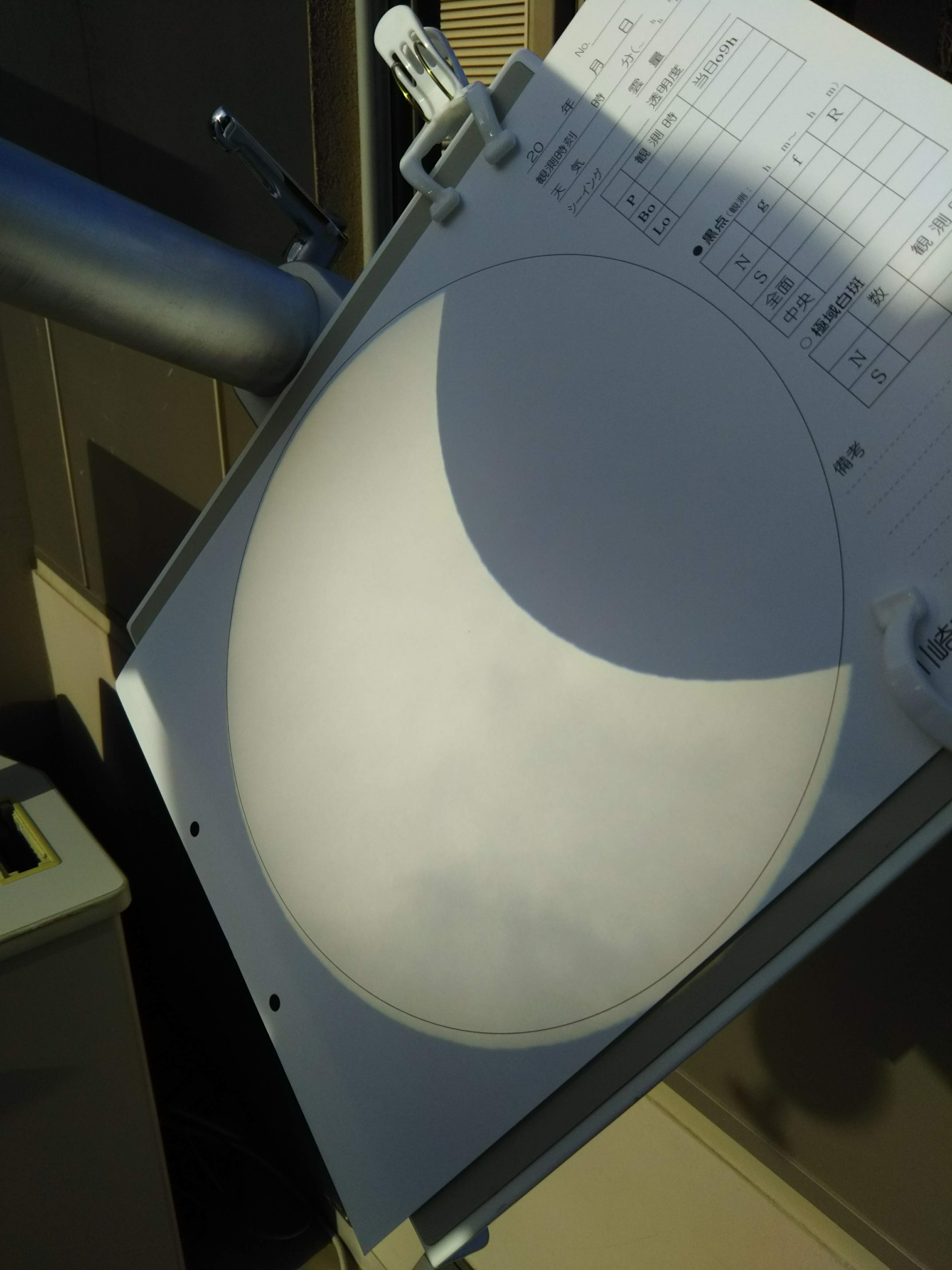 今年(2019年)の天文現象は部分日食からスタートでした。あまり騒がれていなかったので見逃した方も多いかもしれません。天気の方もすっきりとは晴れませんでしたが、雲の晴れ間をぬって、久しぶりの日食を楽しむことができました。下の写真は川崎の科学館のサポーターとして活動しながら、20㎝屈折望遠鏡の投影版に移った日食の様子です。