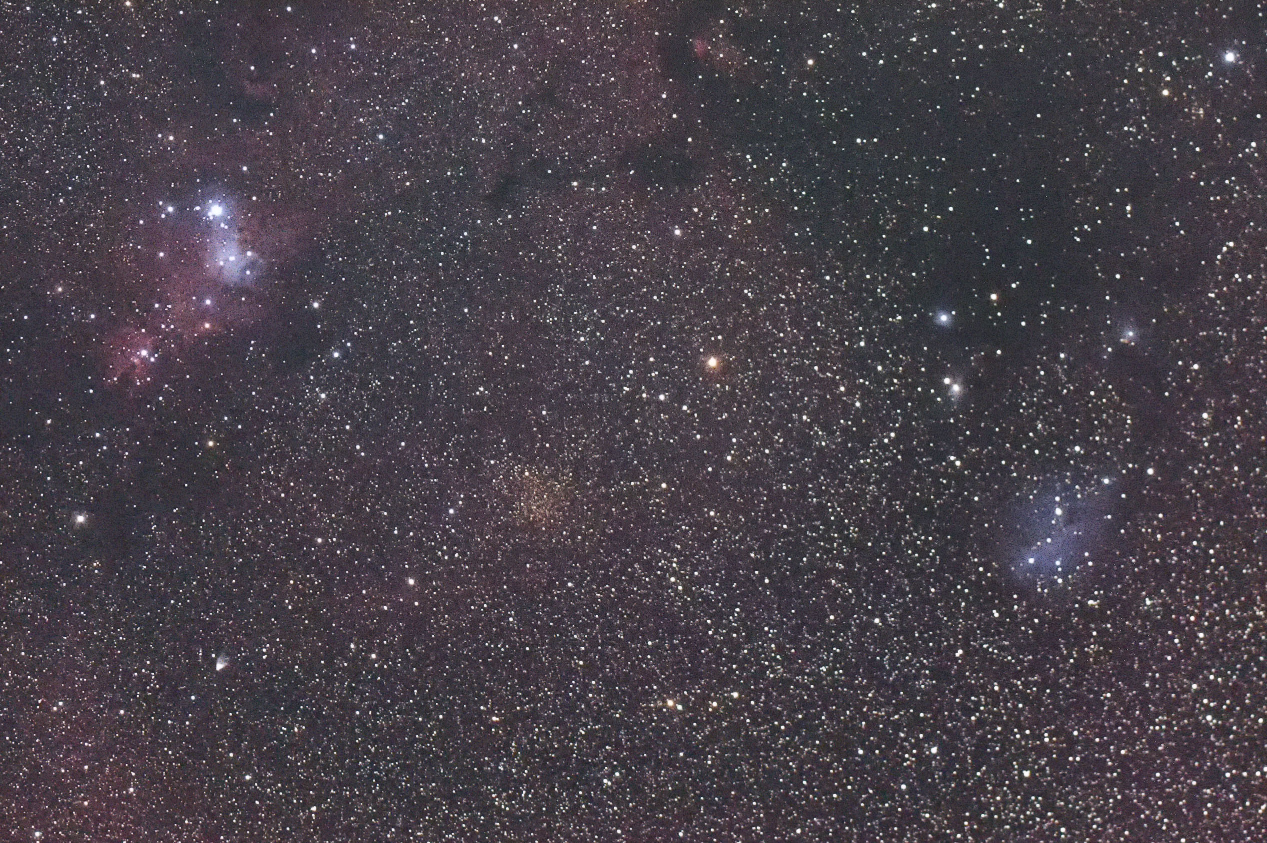 いっかくじゅう座のクリスマス星団とカタツムリ星雲(右)。露出がまだ足りませんでした。