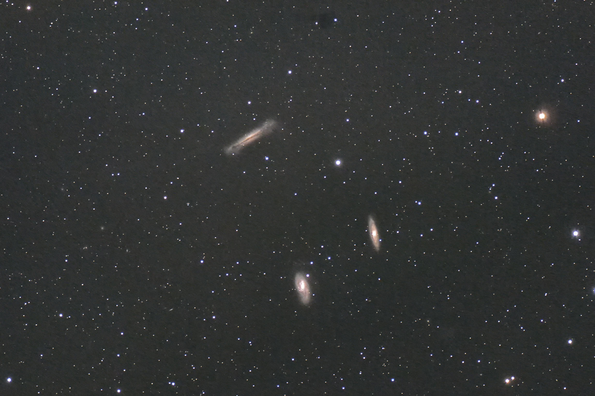 しし座のトリオ銀河、M65(右)M66(下)NGC3628(左上)3500万光年先の小さな銀河群。