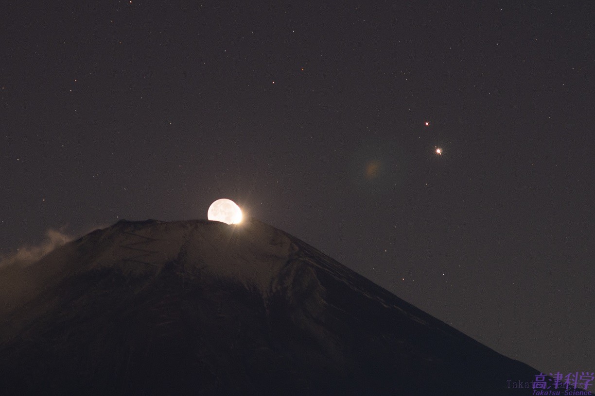 思わず,パール富士(日の出や日の入りはダイヤモンド富士)を撮影しました。木星と土星を際立たせ,富士山も写るようにすると,三日月は,地球照で,満月のようになりましたが,雰囲気は出せたと思います。