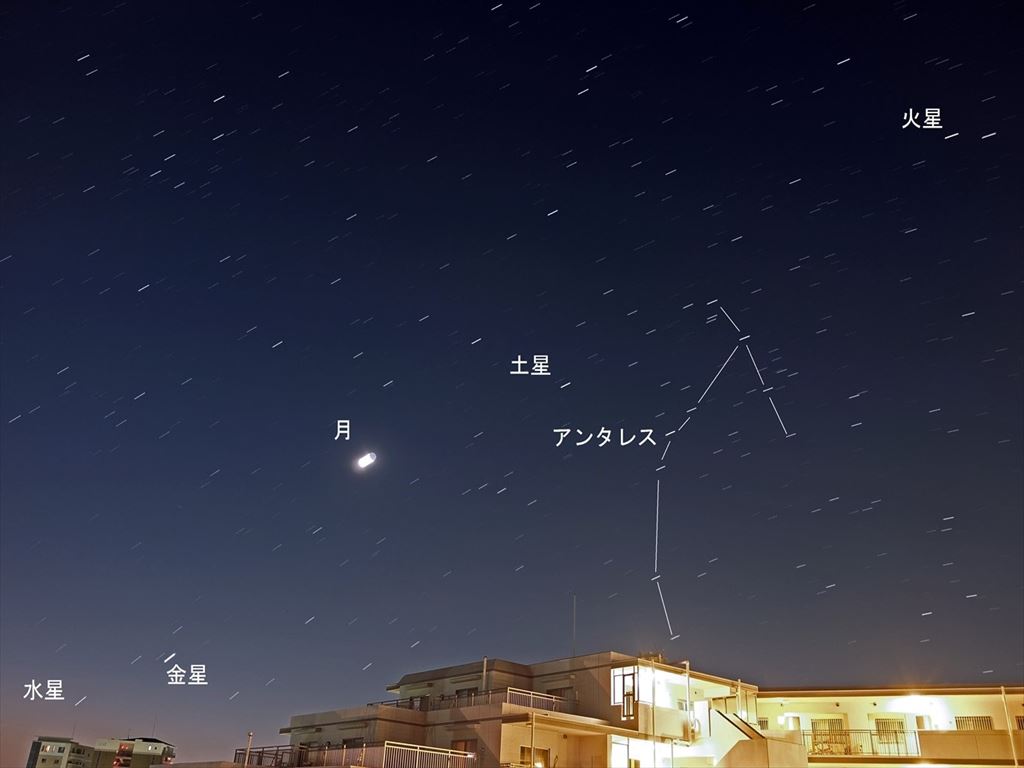 自宅マンションのベランダから,明け方の三日月のような月と惑星,さそり座が加わって,賑やかな星空を比較明合成で撮影しました。
