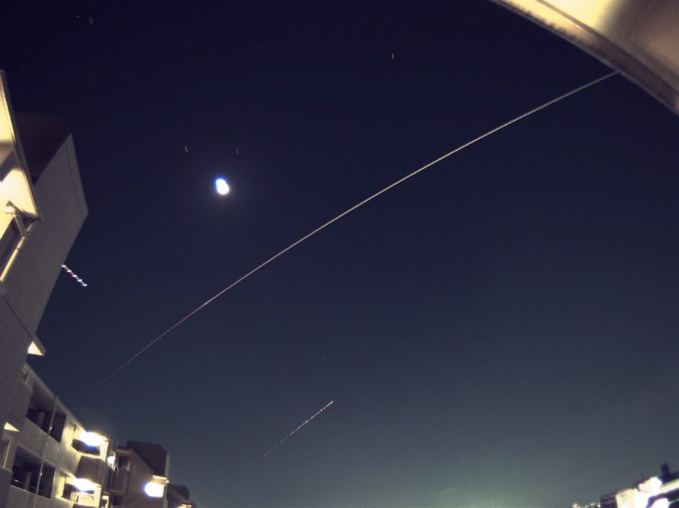 CMSOカメラによる動画撮影を比較明合成。このときはISSに野口宇宙飛行士が搭乗していました。宇宙ステーションは,夕方や朝方に移動するマイナス等級の天体として観察することが出来ます。