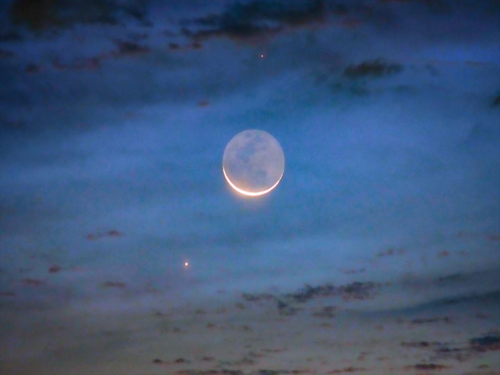 月齢28の細い月と水星(下),火星(右上)の接近を,二子新地の土手から撮影しました。天気予報は曇りだったのですが,暗いうちに起きて自転車で多摩川まで行くと,雲の切れ目に月が現われてきて,なかなか見応えのある写真になりました。