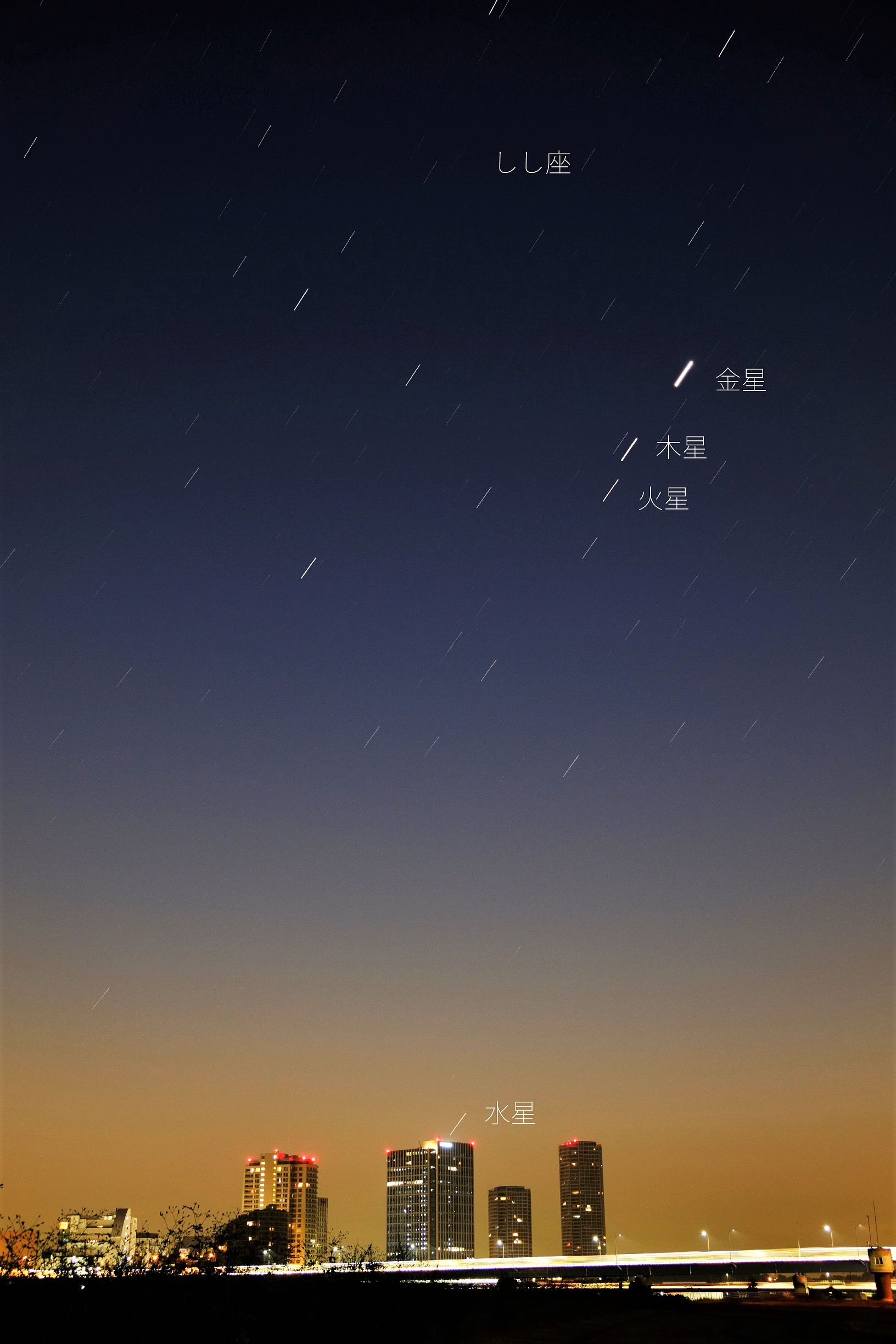 太陽系の五つの惑星をすべて一枚に収めることが出来ました。多摩川の河川敷(諏訪付近)で撮影。左側の明るい照明のつらなりは第三京浜の多摩川橋。
