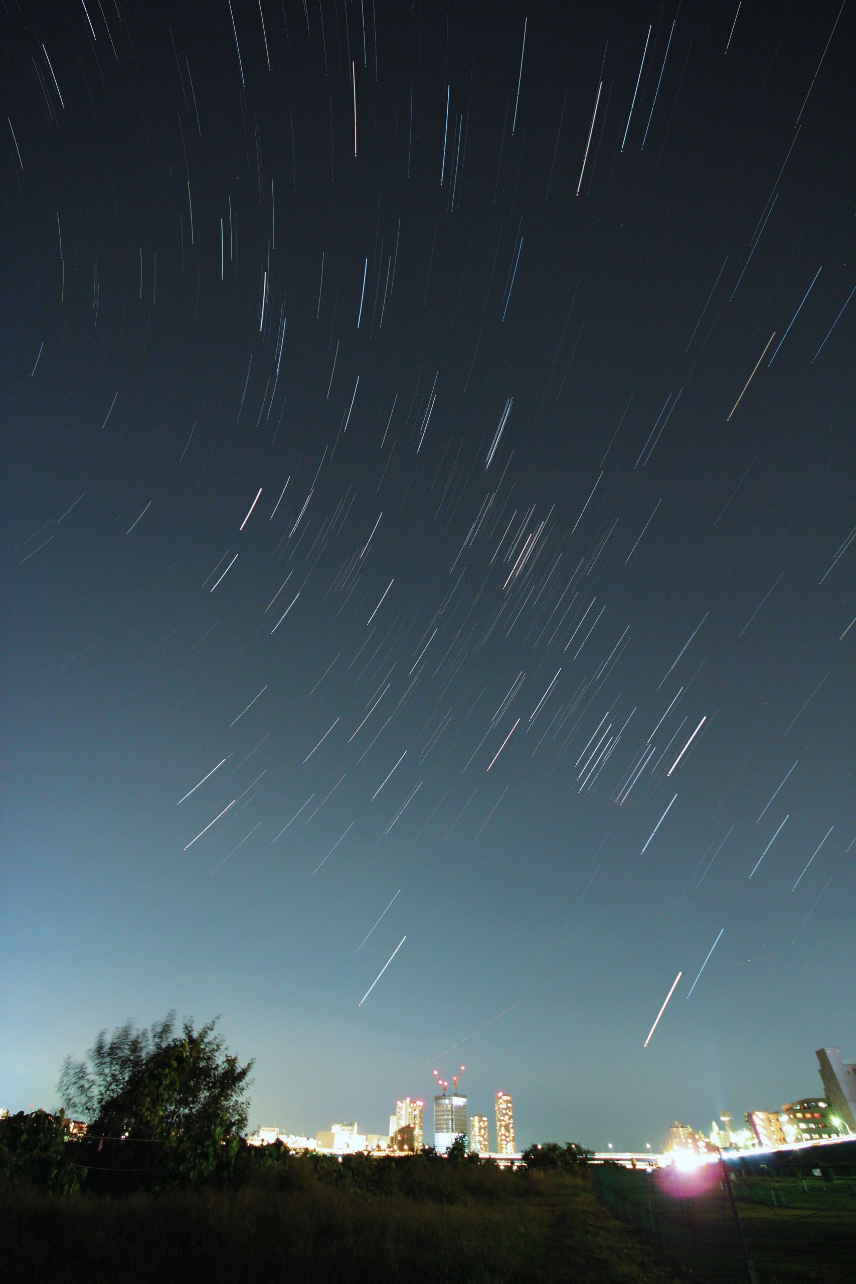 多摩川の河川敷(宇奈根付近)からペルセウス座,ぎょしゃ座,おうし座,オリオン座,シリウスなど,もっとも一等星が多い冬の星空をやはり比較明合成で撮影。