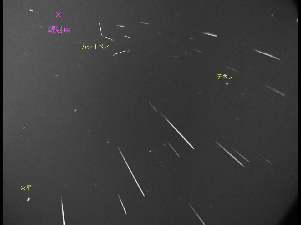 ペルセウス座流星群の流星 2020年8月12日 0:00~03:45 レンズタムロンCCTV2.8mmF1.2 ASI224(CMOSカメラ) 動画撮影で写った21個の流星を比較明合成。高感度のカメラで,流れ星が写る時代になりました。