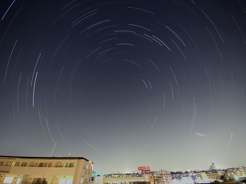 自宅マンション5階の踊り場から北極星を中心にした日周運動を比較明合成で撮影したもの。北斗七星が高い位置に見えています。