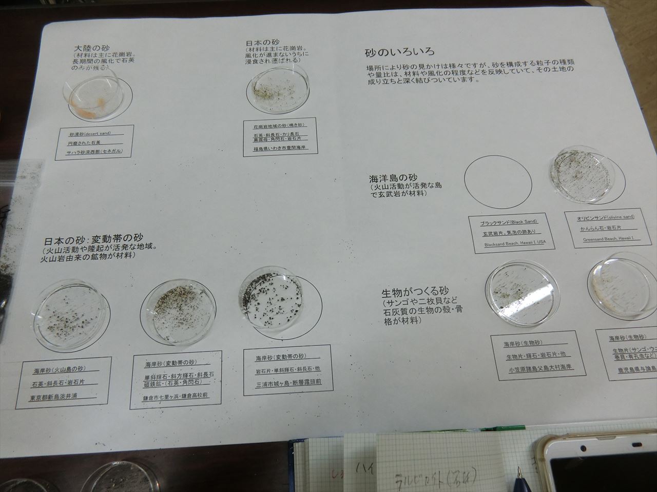 私の地学の授業でも以前から鉱物の授業で砂の観察をしています。火山灰の鉱物でもそうですが,双眼実体顕微鏡を使って観察するとただの砂がこんなにきれいな鉱物からできていることに気づいて誰しも感動します。以前は2種類程度の火山灰で比較していたのですが,砂でたくさんのサンプルを比べるほうが違いが良くわかります。今回小さなプラスチックのシャーレでこのように一辺に並べるのも博物的でいいなと,教えられました。