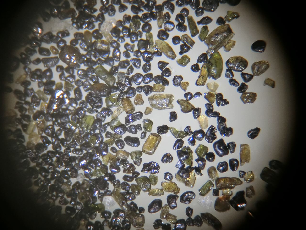 対照的に黒い稲村ケ崎の砂は,ほとんど磁鉄鉱と輝石(緑色)からなっています。他にもサハラ砂漠の砂や,いろいろ観察しました。なかなか手に入らないハワイ島のオリビンサンド(カンラン石を多量に含む緑色の砂)を少しですがわけてもらい良かったです。