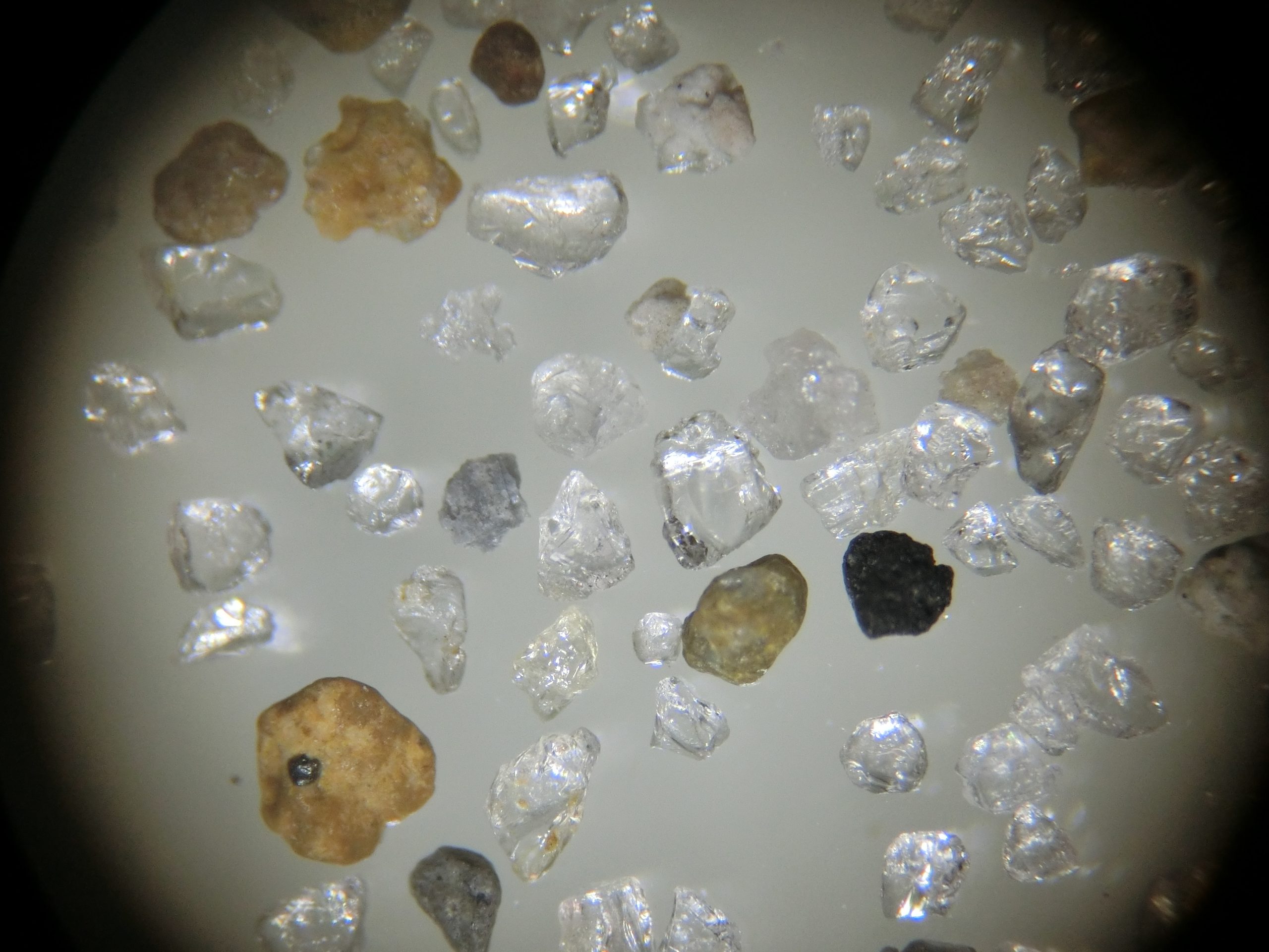 白い砂(伊豆諸島新島の海岸砂)には,石英が多く含まれます。いわゆる水晶ですから小さな宝石といってもよく観察は子供でも楽しい体験になると思います。