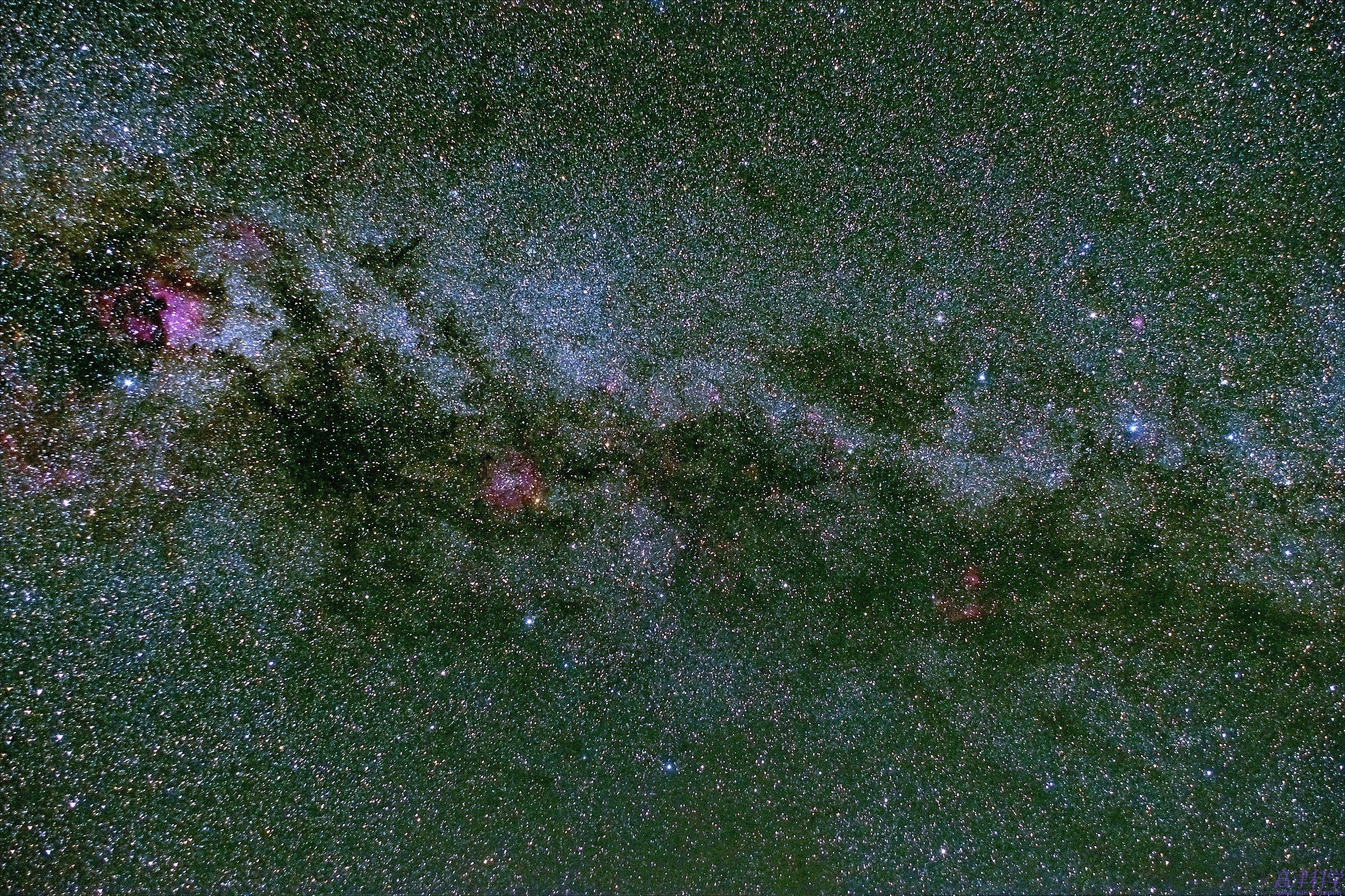 左がはくちょう座の北アメリカ星雲。右端にカシオペア座。真ん中にケフェウス座(IC1396)などたくさんの星形成領域(赤い星雲)があることを,撮ってみて気がついた一枚。2016年10月撮影FacebookXBlueskyCopy