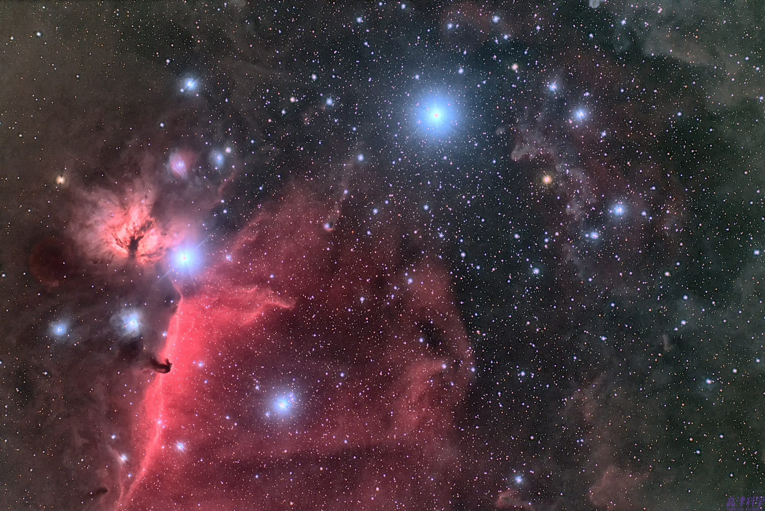 馬頭星雲は,直焦点撮影を始めてから,一種の試金石みたいな対象かもしれません。下は,2016年にやっとオードガイド撮影ができるようになって,晴れ間を求めて日光戦場ヶ原へ遠征して撮った1枚。EOSkissX5の電池がなくなったので,Fuji XE-1でビギナーズラック的に色がきれいに出たものです。全体に青紫赤っぽいのが、Fujiフィルムの最近のミラーレスカメラの特徴だとおもいます。天体写真は同じ対象でも、撮影した空の状況(明るさ)や透明度そのほか、いろいろな要素によって写りが違うことを実感した1枚です。戦場ヶ原へは初めて行ったのですが、今までの遠征でもっとも条件が良かった気がします。