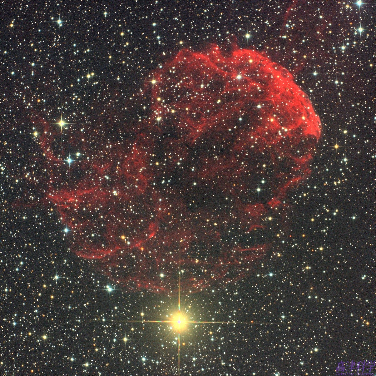 IC443,通称クラゲ星雲。赤いので水素ガスの散光星雲のようでもありますが,複雑な構造から超新星残骸と考えられているそうです。形がまさにクラゲで,ゆらーりした形はユーモラスですが,赤の色合いと形のコントラストがあまり好きになれない対象です。