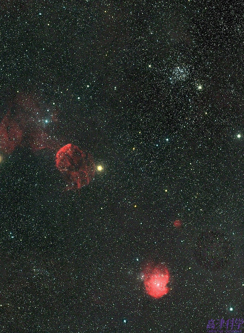 APS-CサイズのCMOSでふたご座の散開星団M35と,散光星雲NGC2174(通称モンキーフェイス星雲)の三つを入れた構図です。クラゲ星雲の東側にさらに淡い星雲が広がっていて,ここまで含めてあぶりだしている方もいます。