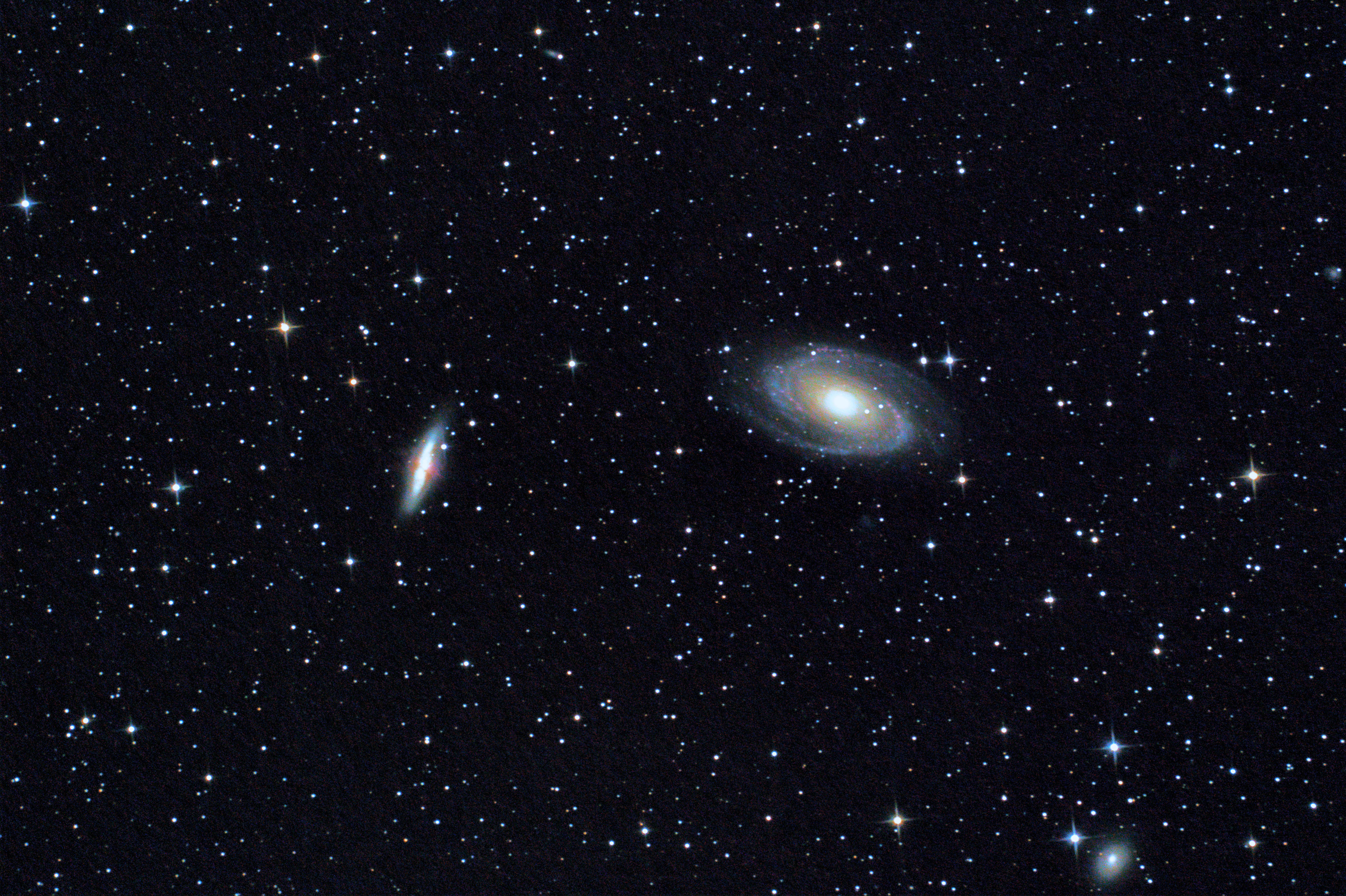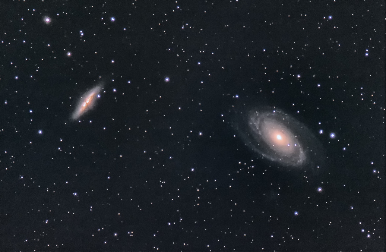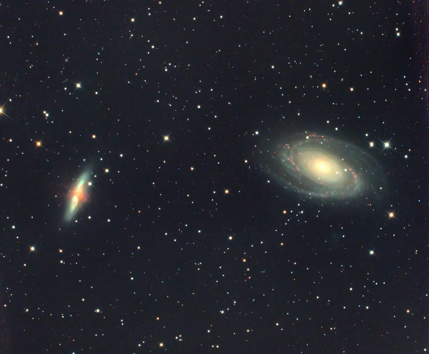 2019年12月,撮影機材を75mmの屈折望遠鏡から,口径13cmの反射望遠鏡に変えました。その2回目の遠征で撮影したのが次の画像です。M82 は爆発銀河と呼ばれていて,そのガスが赤く上下に吹き出す様子が特徴ですが,HEUIB-Ⅱフィルターの効果が良く出て見えるようになりました。M81の渦の腕の具合も口径が大きい分はっきりしたようです。