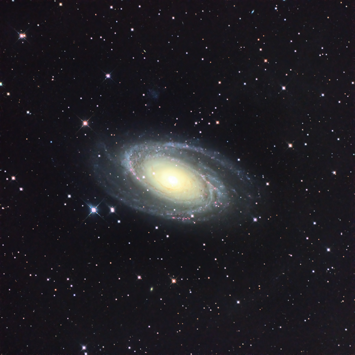 BKP130(13cmニュートン反射)とCMOSカメラ(ASI533MC)でようやく撮影できたので,以前のものと比較してみてください。やはりHEUIB-Ⅱフィルターで,M82のジェットや,M81の星形成領域(赤ポチ)がよくでました。露出時間は5分20枚(1時間40分)です。