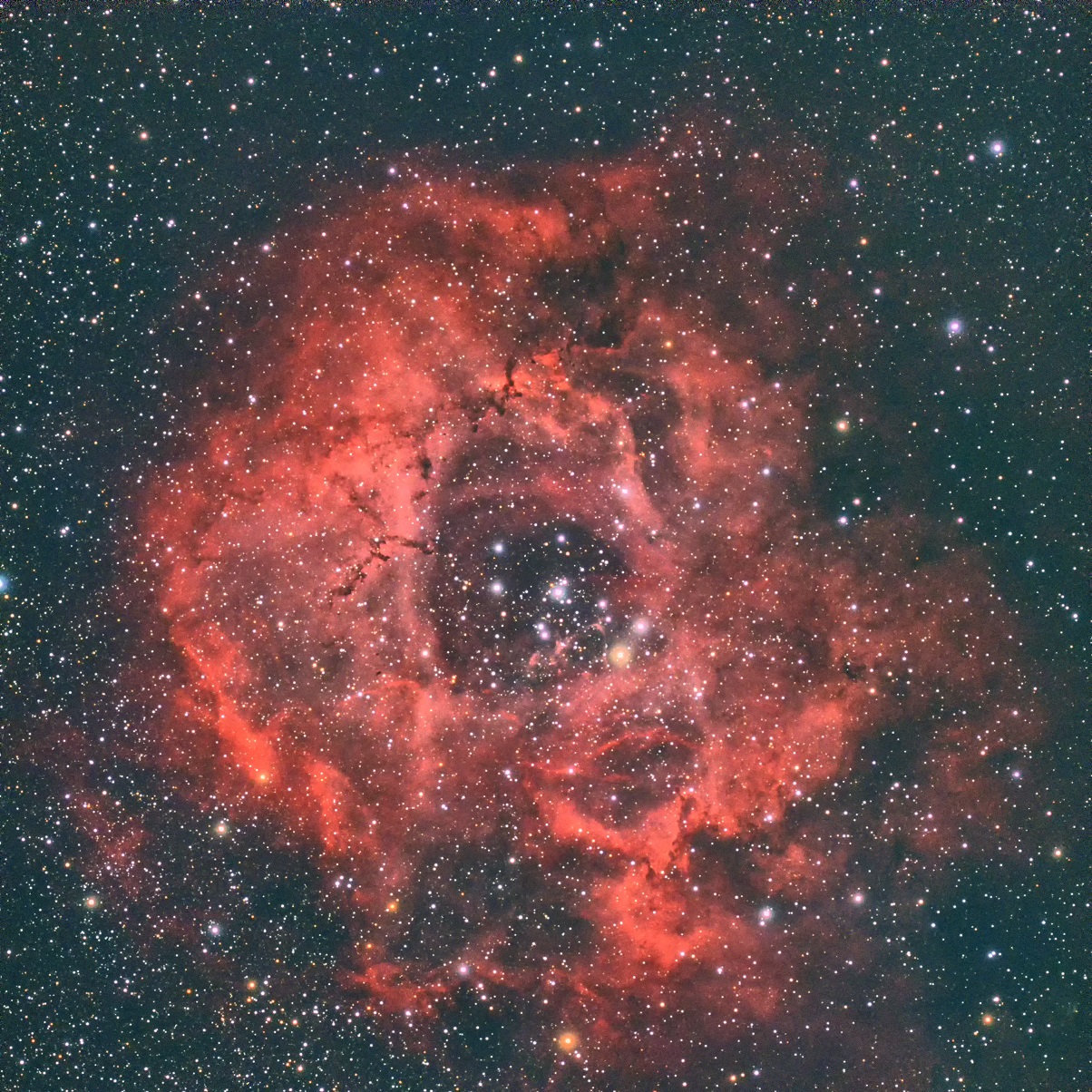 散光星雲の中ではオリオン大星雲の次にポピュラーな星雲だと思います。ただし肉眼では見えませんし,赤外フィルターを外した改造カメラでないと写しずらかったのですが,CMOSカメラなどではよく写ります。新しい屈折鏡筒と1インチサイズのセンサーで画角いっぱいに撮ってみました(2022年12月)。