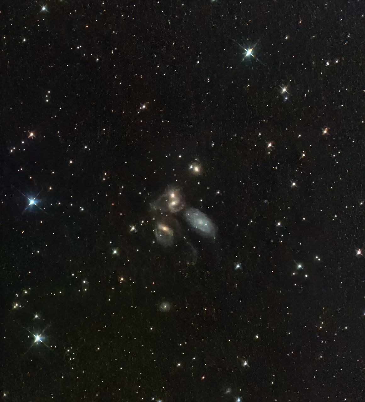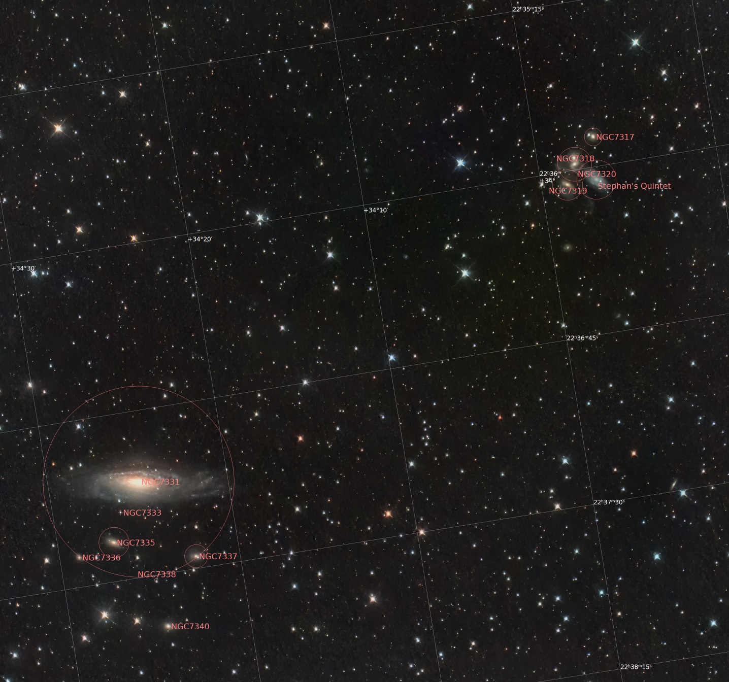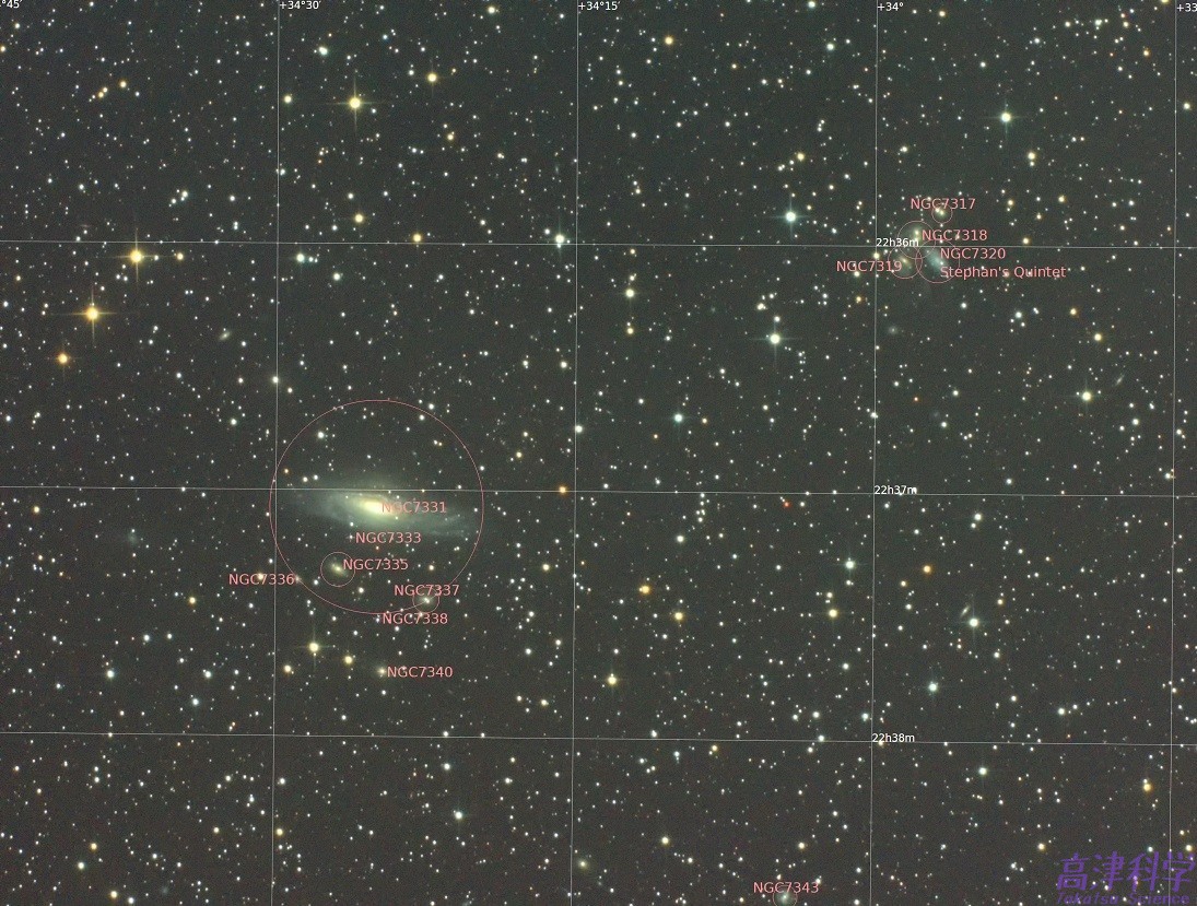 銀河団といえば,おとめ座やかみのけ座が有名ですが,ペガスス座にはステファンの五つ子という局部銀河団があって,今まで大望遠鏡で撮影された写真をよく見かけました。しかし,小さいながら写すことができるようなので冷却CMOSカメラで撮影してみました。近くにNGC7331という比較的大きな銀河もあるので,このサイズでも絵になるようです。Pixinsightnという画像処理ソフトをつかうと,プレートソルビング(画像から天体の位置や情報をマッチさせる機能)で,自動的に注釈をつけてくれます。五つの銀河が寄りかたまっていますが,NGC7320は,この銀河群にあるのではなくずっと手前(約4000万光年)にあって,たまたま重なって見えるそうです。この銀河群(ヒクソン銀河群)までの距離は赤方変位から約3億光年も離れているそうで驚きです。