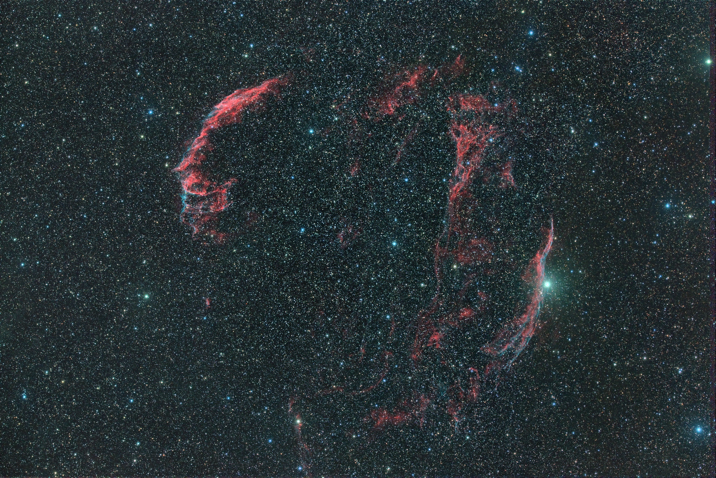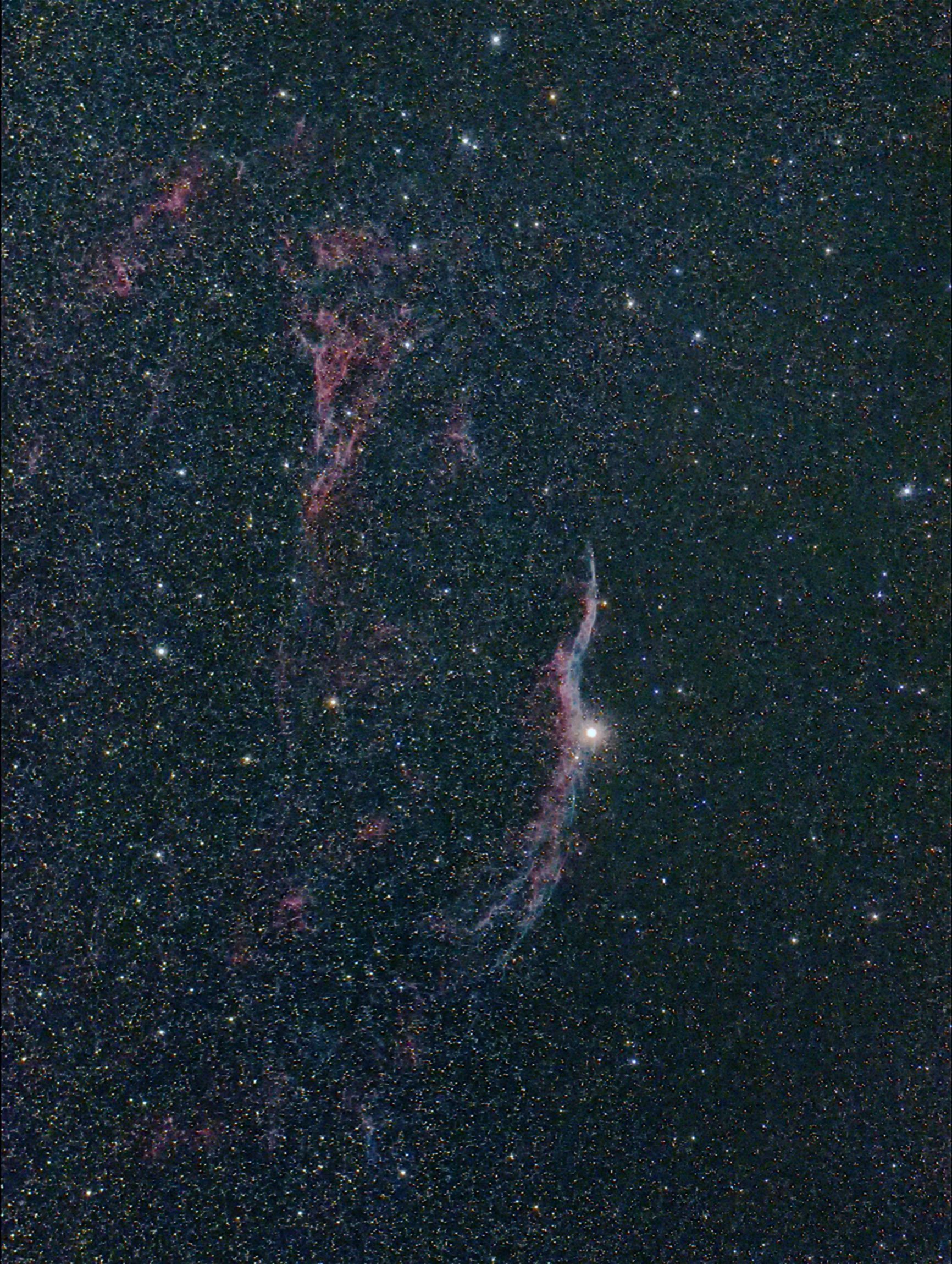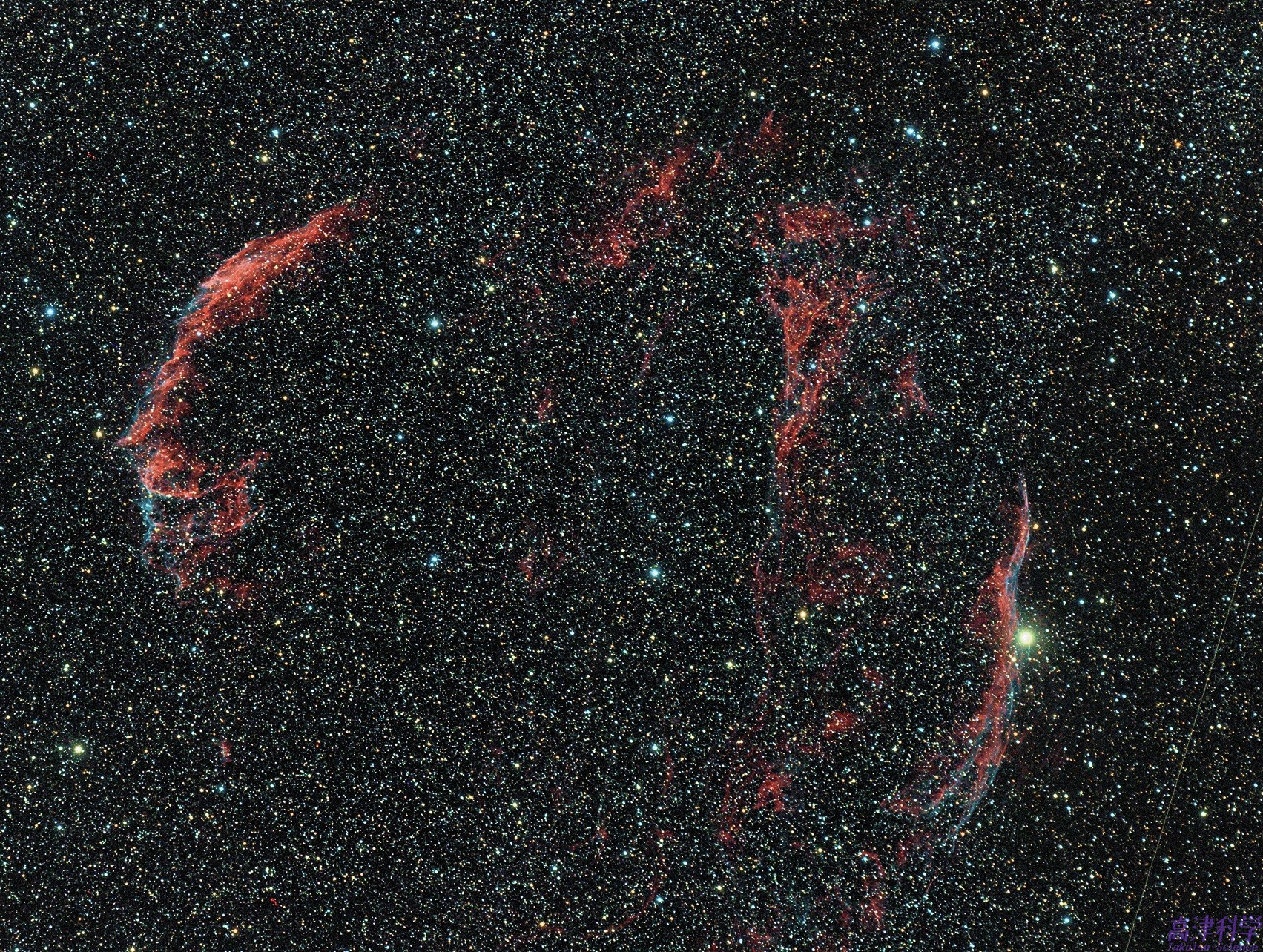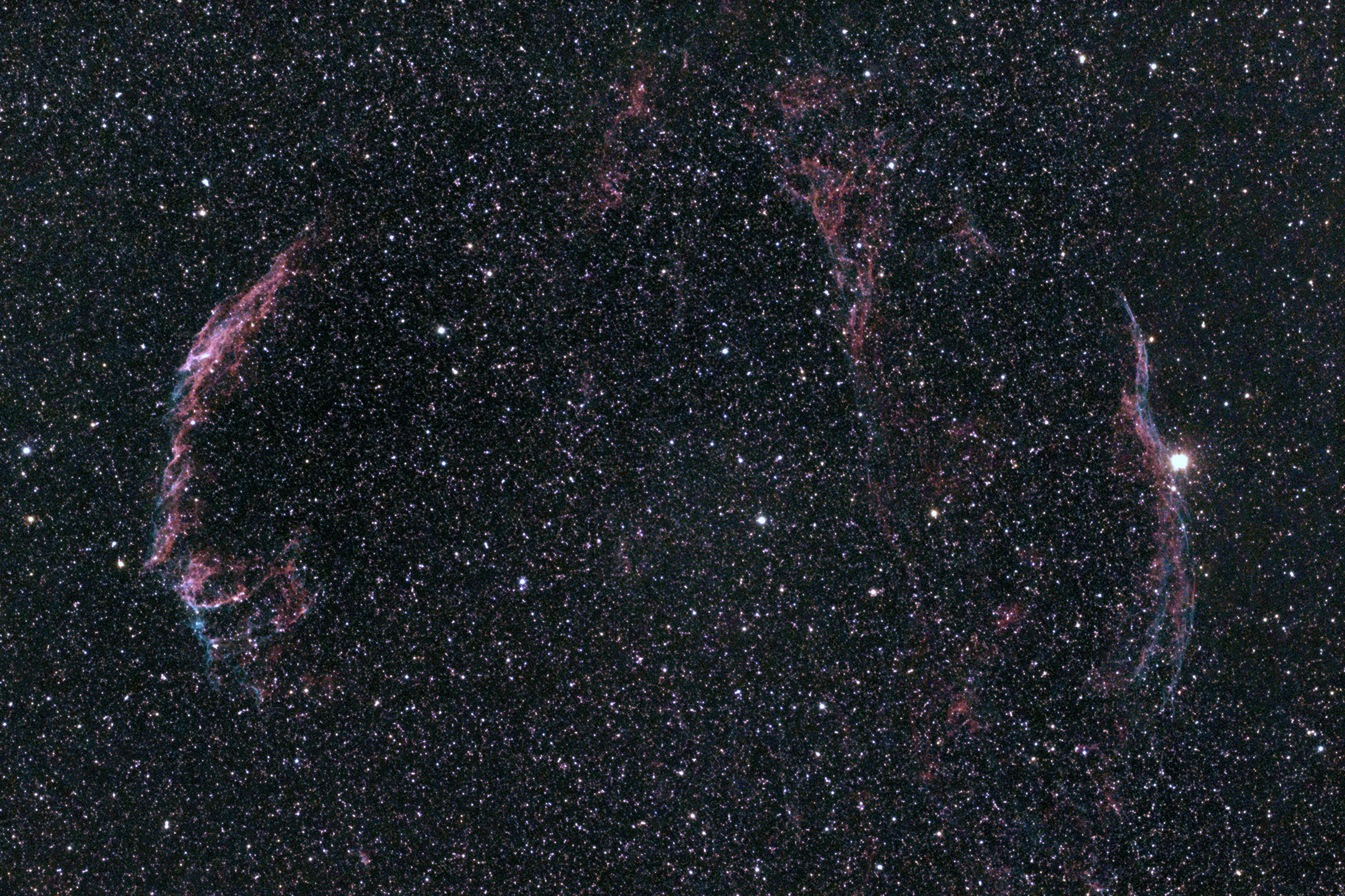 はくちょう座にある超新星残骸NGC6992-5,別名ベール星雲とか網状星雲とよばれています。2年ぶり(2019年)に南側(左)の部分も一緒に入れた構図で撮影しました。