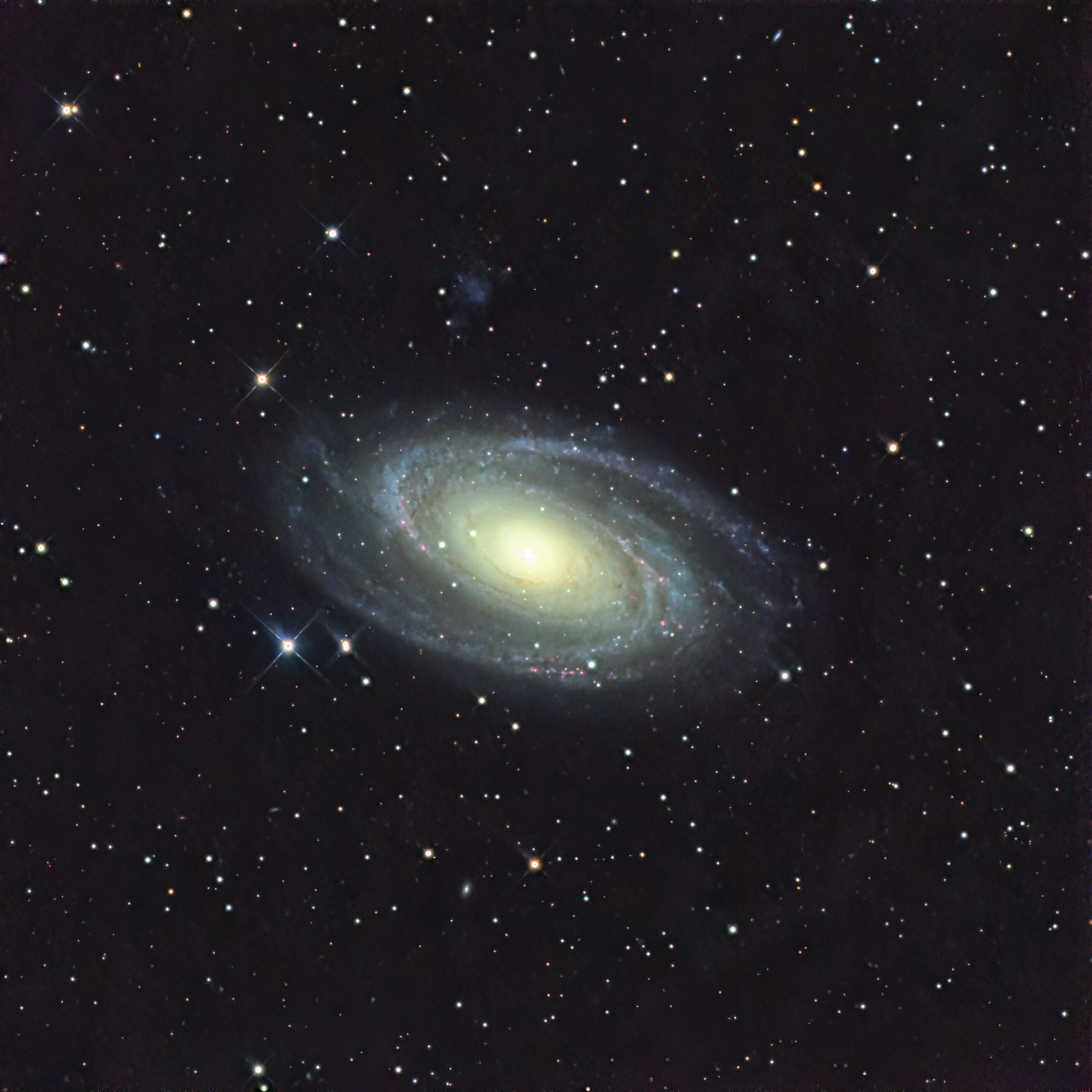 英語でもSunflower Galaxyと呼ばれているそうで,渦の暗黒体構造が特徴的な銀河です。銀河の形や表情はいろいろでハッブル以来分類やでき方が議論されていますが,最近は銀河どうしの合体や,併合によって進化することが主な原因とされているようです。このりょうけん座の多くの銀河(M51など)は同一の銀河群に属するそうです。