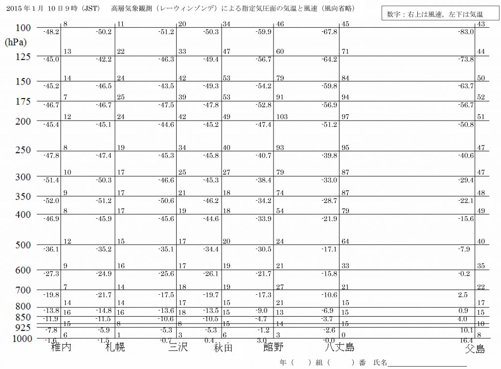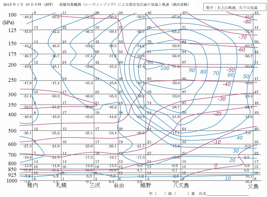 資料(データ)は,気象庁の気象観測月報2015年1月から抜き出した,10日9時(JST)の稚内から父島(東経140°)の指定気圧面の気温と風速(ほぼ西風)です。プロファイルの地点と気圧面の交点の右上に風速(m/s),右下に気温(℃)が記入されています。
