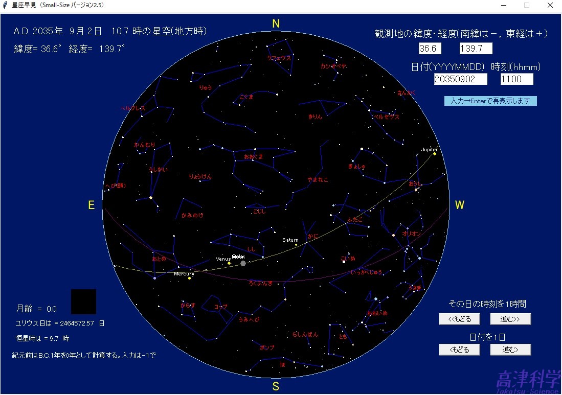 ダウンロードページにあるデータファイル「seizaData」をダウンロードして,同一ディレクトリに置いて 実行すると,ステレオ投影図法の天球に恒星と星座線,星座名および月惑星(太陽も)が表示されます。右上のinputボックスに見たい年月日や時刻を例にならって入力し(例;YYYYMMDD=20201028→2020年10月28日)Enterキーを押してください。 初期状態で表示されるのは,2035年9月2日の日本の北関東で起こる皆既日食になっています。 昼間も夜空のように星が見える天体シミュレーターとしてつくられています。