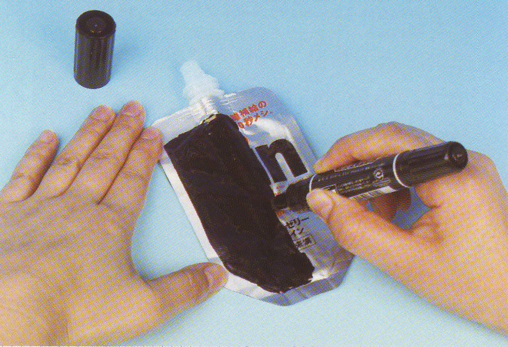 ①カラにしてよく洗ったゼリー容器の片側を太陽光を吸収しやすいように、油性ペンで黒く塗る。水の入らない縁の部分はぬらない。黒い部分の面積を計算しておきます。