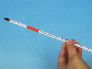 用意するもの:ゼリー飲料の容器(口の部分がふさがっていないもの)、棒温度計(100均の水槽用が良い)、計り(キッチン用)またはメスシリンダー、ゴム風船、発泡スチロール板、黒の油性ペン、カッター、木工ボンド、つまようじ