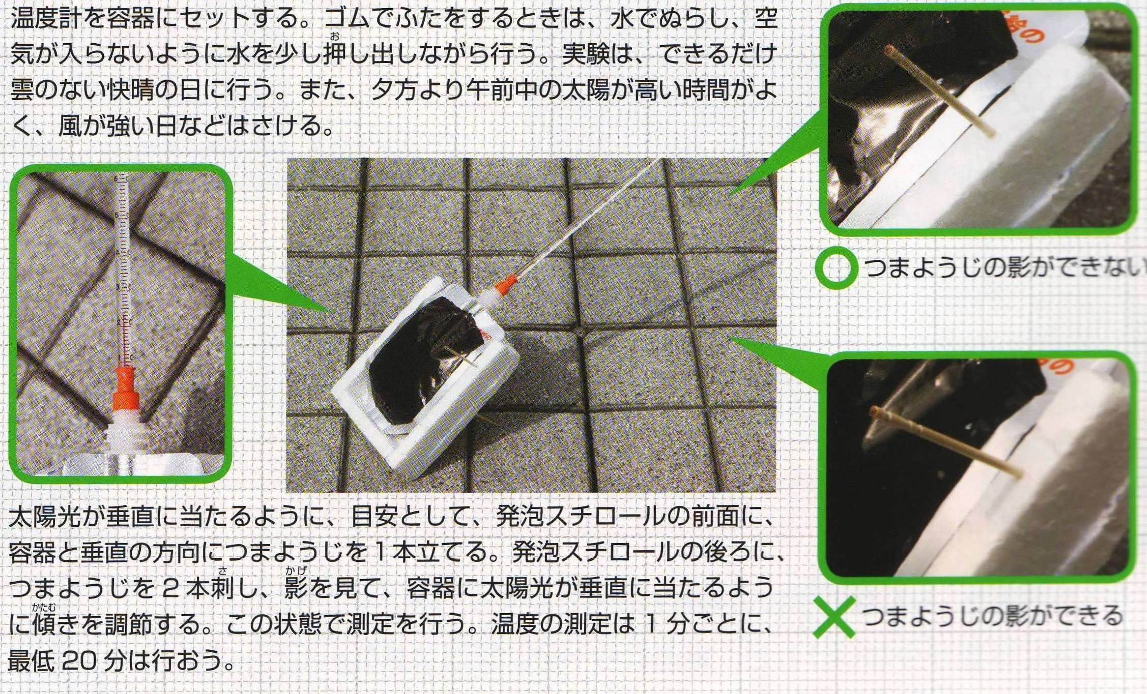 晴れている日に実験を行います。1分ごとに温度を測定します。水の量はあまり多くないほうが良いです。測定後に水の重さまたはメスシリンダーで体積をはかり、次のような計算で求めます(容器の温度上昇は無視しています)。