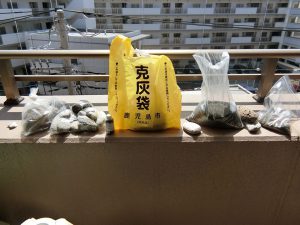 ちなみに、途中で火山灰を掃いたりする作業をされている方にお願いして、火山灰をもらってきました。たくさん持ってっていいよ、と言われましたが、その時もらった黄色い袋が貴重な教材になりました。