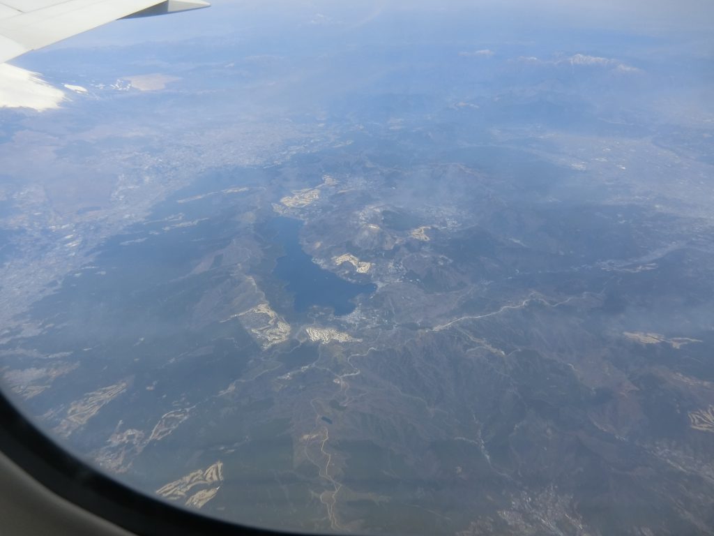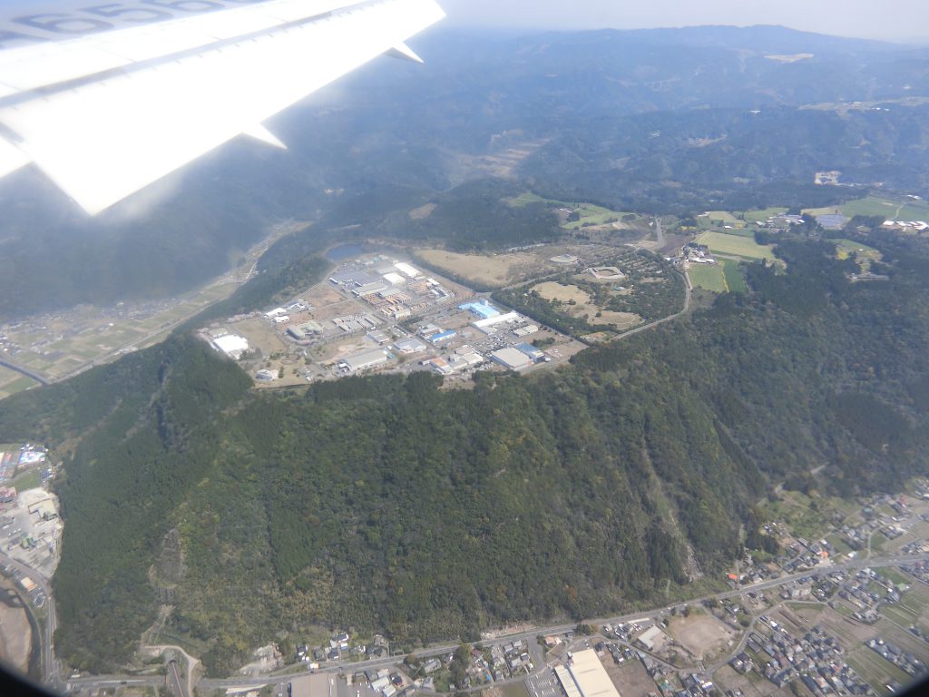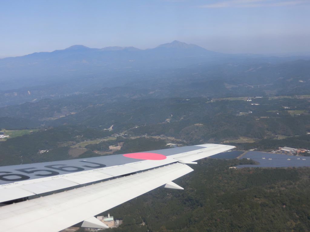 四国上空からは晴れてきて、着陸態勢に入ると霧島連山(ほぼ真ん中あたりが新燃岳)が良く見えます。前日(3月25日)には噴火が起きていたのですが、噴煙などは見えませんでした。